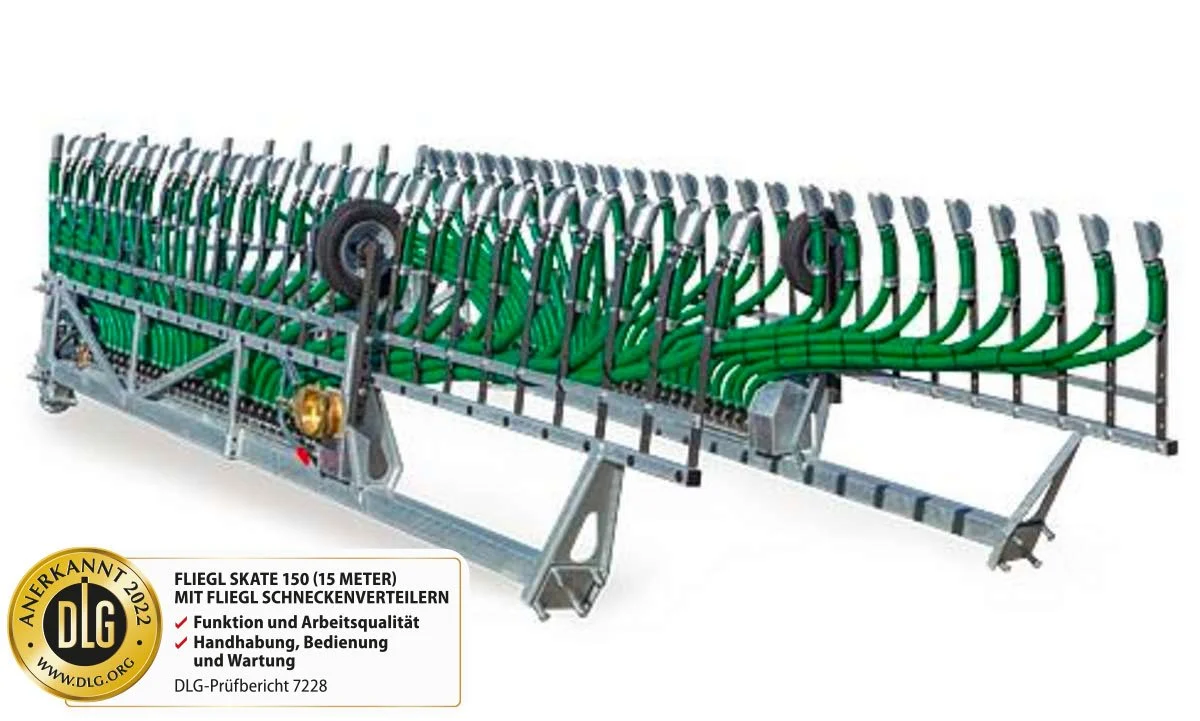 Der Schleppschuhverteiler Skate aus unserem Hause bietet für Sie als Landwirt bzw. Lohnunternehmer beste Voraussetzungen Ihre Gülle schlagkräftig und vor allem emissionsarm auszubringen. Gerade der Verlust von Ammoniumstickstoff wird durch die bodennahe streifenförmige Ausbringung im Vergleich zu Breitverteilung mit Prallkopf oder Schwenkverteiler um ein vielfaches reduziert. Nicht nur an Fliegl Fässer sondern auch an vielen Fässern von Fremdherstellern lässt sich der smarte Verteiler nachrüsten. Der Skate wird serienmäßig mit dem patentierten Schneckenverteiler von Fliegl ausgestattet.