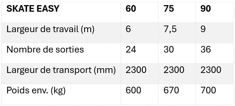 Fliegl élargit sa série SKATE avec un épandeur à patins compact offrant des largeurs de travail de 6000 mm, 7500 mm et 9000 mm. Avec un poids de seulement 750 kg (SKATE 90), il est particulièrement optimisé en termes de poids. La position flottante garantit à tout moment une adaptation parfaite au sol, tandis que la commande s'effectue via la commande confort – en option également via ISOBUS. Avec une largeur de transport de 2,30 m, le SKATE EASY est idéal pour les petites tonnes à lisier et convient parfaitement pour un équipement ultérieur. Pour tous ceux qui recherchent une distribution précise avec un poids minimal.